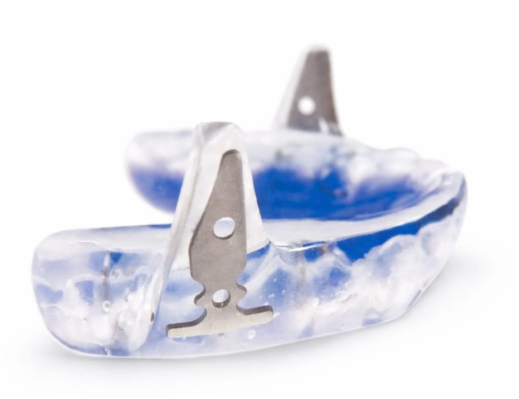 Las aletas inferiores ,específicas para los dos lados derecho e izquierdo, han sido diseñados para el maximo confort del paciente y encajan perfectamente con el plano angulado de 70º del cuerpo de los tornillos superiores. El material transparente con el cual son fabricadas es compatible con cualquiera resina ortodóntica acrílica, los refuerzos internos de metal pueden ser anatómicamente adaptados y englobados en el resina de la férula inferior,garantizando la resistencia necesaria para el avance mandibular en los pacientes adultos.